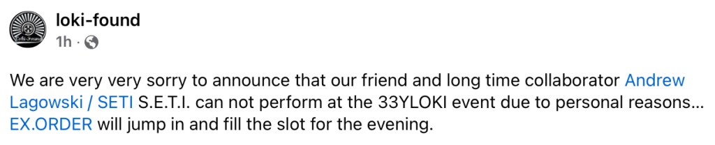 S.E.T.I. will not be performing at the below due to personal reasons. EX-ORDER will fill the slot on the evening.