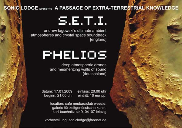 For those interested in the technical nature of my S.E.T.I. work, this particular material uses Ableton Live as a sound production and mixing environment, with other sounds being supplied by Reaktor, Reason, iPod Touch running Jasuto and Plogue Bidule.